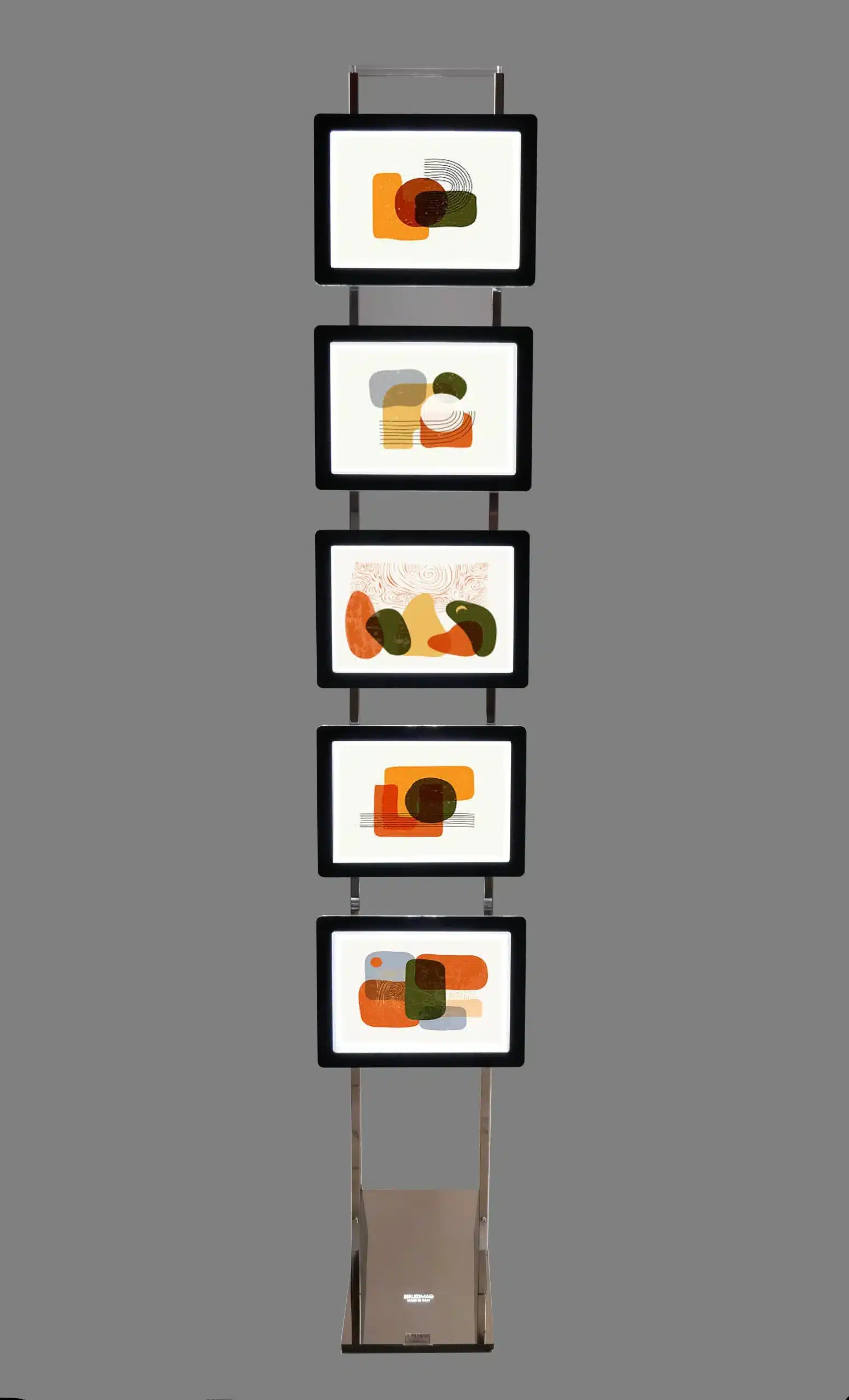 Le totem LED est une structure verticale en acier chromé . Il est destiné à accueillir des portes affiches LED au format A4 ou A3 qui viendront se fixer grâce à un système d’aimants. Ce système d’accroche rend donc le dispositif totalement ajustable et très facile à utiliser.