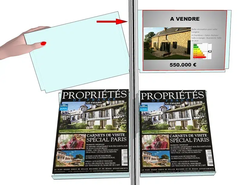 Les Porte Annonces sont réalisés en pliage type « Porte feuille ». L’insertion des documents consiste à écarter les 2 épaisseurs.