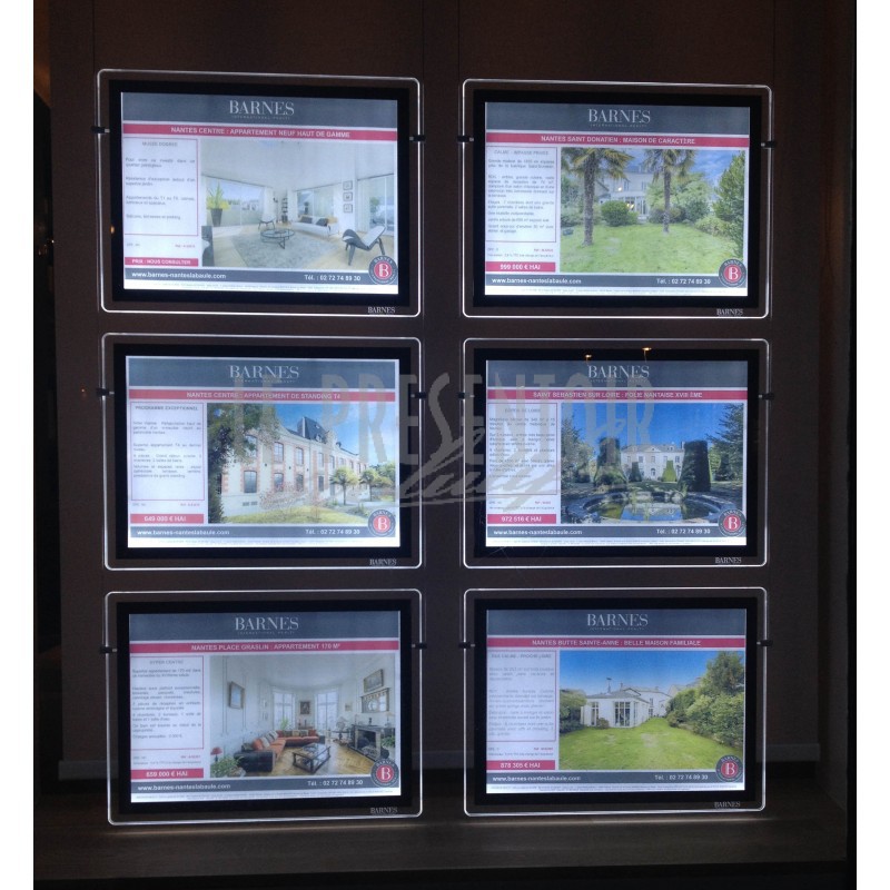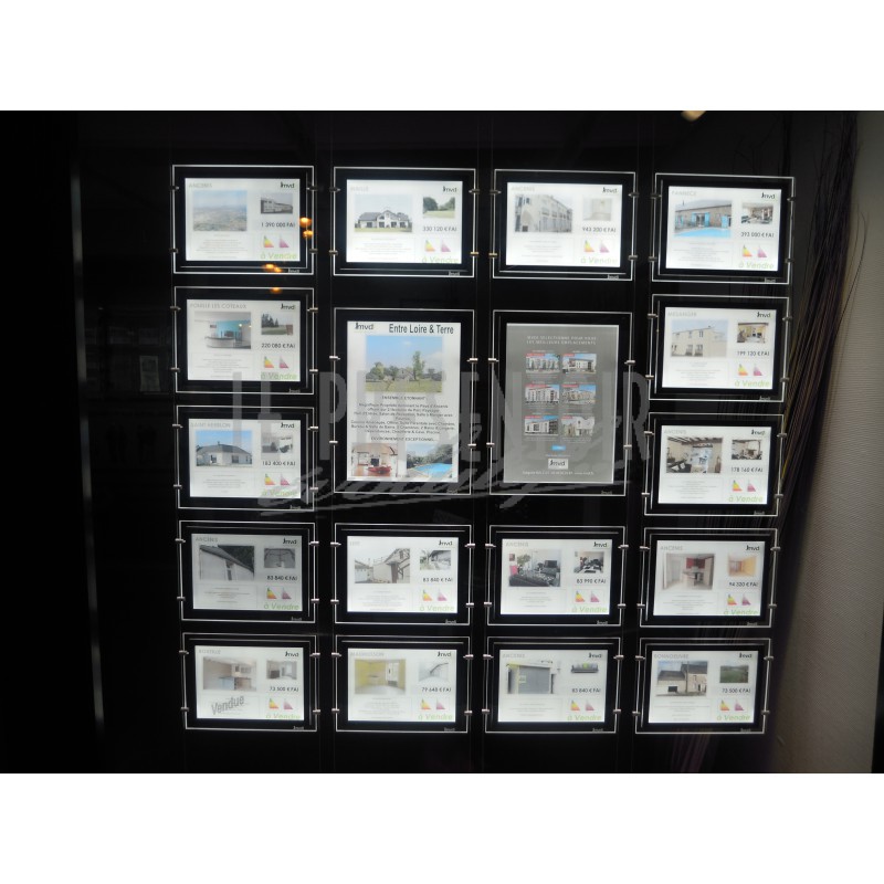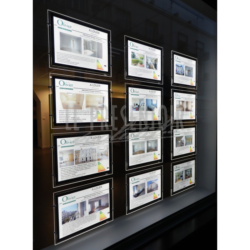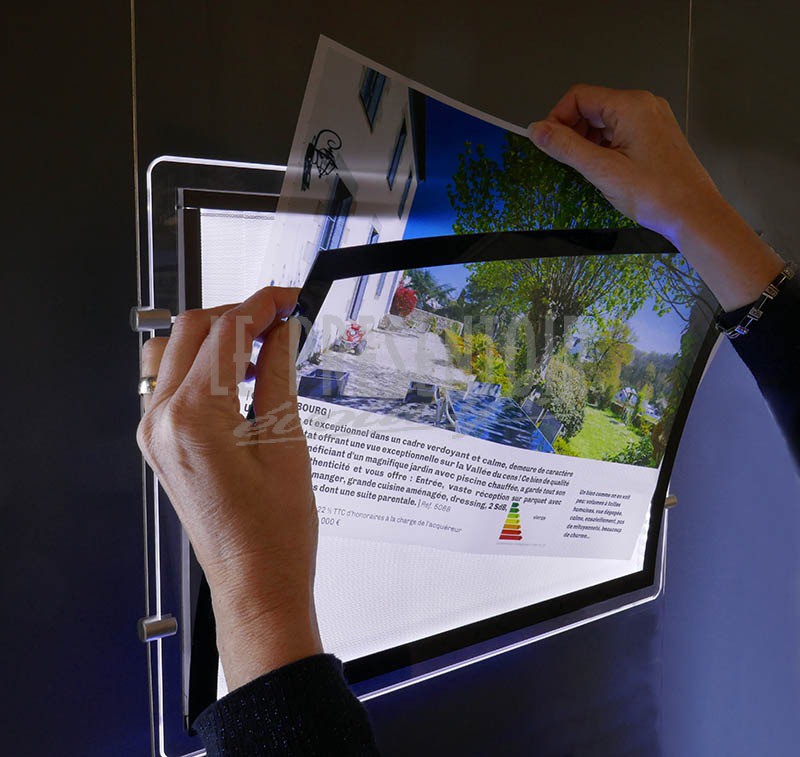 Finitions aux Choix : Angles Carrés ou Arrondis, Contours Gris ou Noirs. Ouverture totale pour un remplacement facile de vos affiches. Le Porte Affiche « MEGA » avec ses 6000 lumens est l’un des plus lumineux du marché. Une consommation de 4 à 9 w entre un format A4 et A3.
